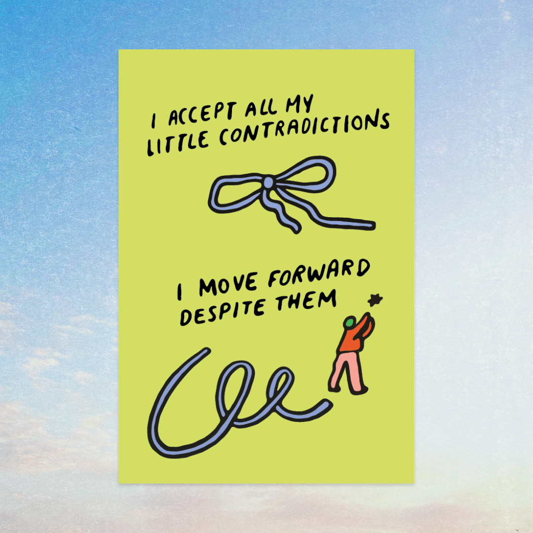 An original art print with the phrase, "I accept all my little contradictions, I move forward despite them." Illustrated with a creative process that begins with writing long-form as the first step to capture thoughts organically, and then using simple imagery and lines to pull and highlight single feelings or ideas.