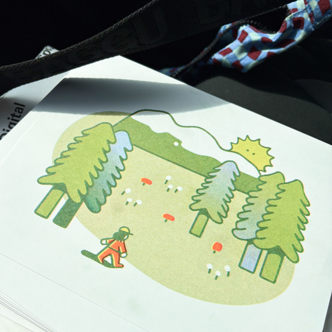 A risograph printed piece of a hiker crossing through a landscape of evergreen trees, mushrooms, mountains, and other PNW staples.